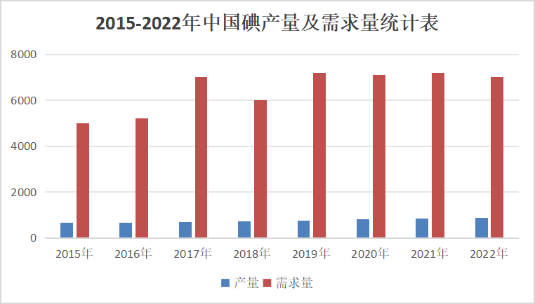 有数据表明2015年我国的碘需求量大约在5000-6000吨/年,且年增长率达到5%,但年产量仅约800吨左右;跟日益增长的需求量相比,我国每年还需要大量进口碘产品,中国进口碘产品曾一度占到中国总需求量80%以上。因此,碘的新来源成为了摆在我国面前的一个难题。